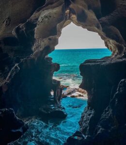 À l’intérieur, l’atmosphère est fraîche et humide. Les parois rocheuses, sculptées par l’érosion naturelle et autrefois exploitées par l’homme, créent un décor impressionnant. La lumière qui pénètre par l’ouverture sur l’océan offre un jeu d’ombres et de reflets spectaculaire, surtout au coucher du soleil.